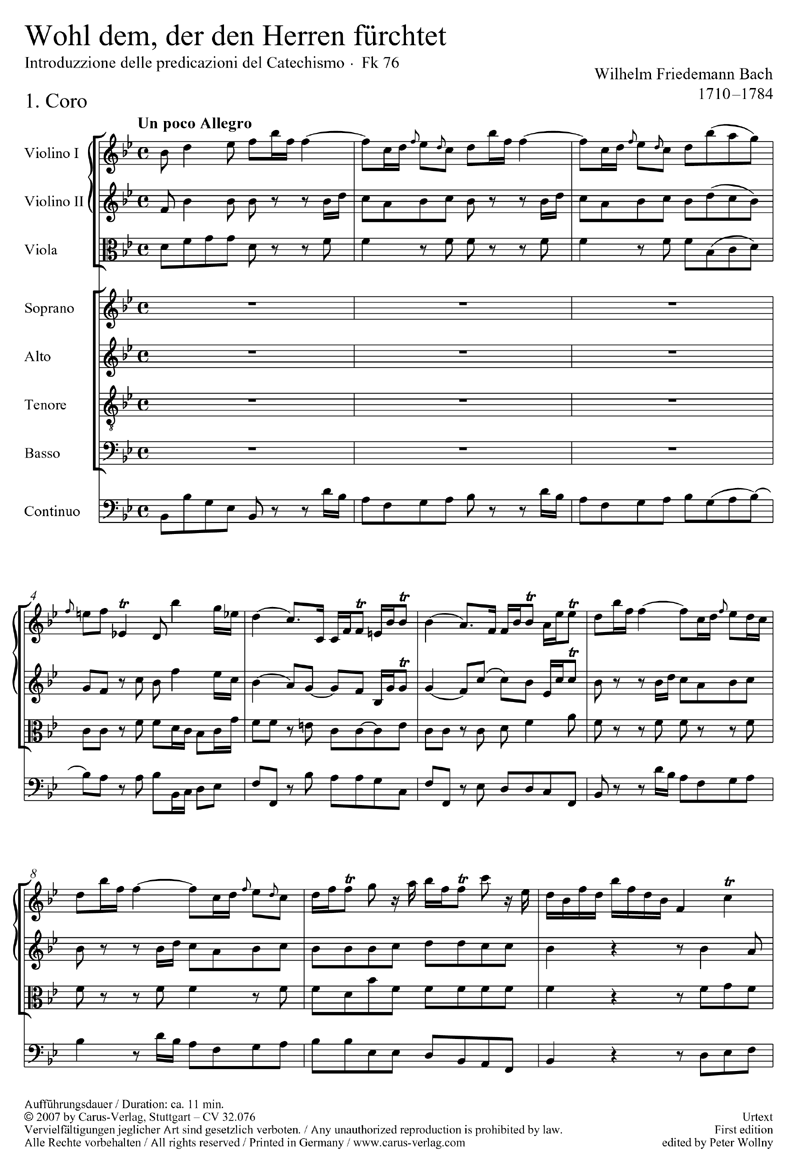 Die Kantate ist eines der wenigen erhaltenen Vokalwerke, die Wilhelm Friedemann Bach in seiner achtzehnjährigen Amtszeit als Organist und Director musices der Marktkirche zu Halle (1746-1764) komponiert hat. Das hier erstmals nach mehr als 250 Jahren veröffentlichte Werk bildete die Eröffnungsmusik für die Hallenser Katechismuspredigten des Jahres 1752. Die musikalisch und technisch anspruchsvolle Komposition besteht aus zwei großen rahmenden Chorsätzen, die teils konzertant, teils polyphon gesetzt sind und zwei biblische Dikta vorstellen. Sie umrahmen ein empfindsames, zugleich aber kontrapunktisch strenges Duett für Sopran, Alt und Basso continuo, in dem 'Gottes süsse Seelenlehre' als das wahre 'Manna' des Gläubigen bezeichnet und damit eine Verbindung zum Aufführungsanlass hergestellt wird. In der Dichte der musikalischen Ausarbeitung und der Intensität des Ausdrucks bewegt sich W. F. Bach in diesem Werk deutlich hörbar in den Fussstapfen seines Vaters. - Soli SA, Coro SATB, 2 Vl, Va, Vc/Cb, Org