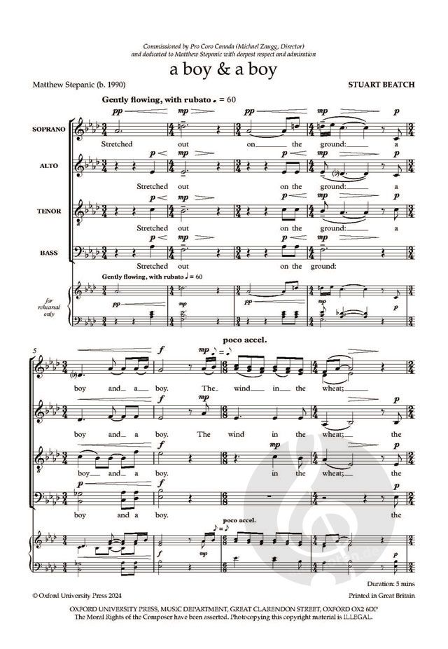 Stuart Beatch's a boy & a boy sets a romantic and ultimately tragic text by poet Matthew Stepanic. Written as a response to Eric Whitacre's well-known work A Boy and a Girl, Beatch describes this piece as a 'queer love song'. The poem is illuminated by lush harmonies and conversational textures.