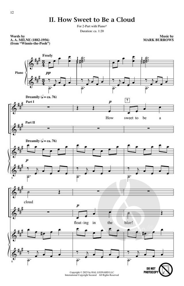 Zwei klassische "Winnie-the-Pooh"-Gedichte aus dem kreativen Kopf von A.A. Milne werden von Mark Burrows auf humorvolle und süße Weise für 2-stimmige Stimmen vertont. Viele junge Menschen sind mit diesen Gedichten nicht mehr so vertraut, so dass dies eine wunderbare Möglichkeit ist, sie Ihren Schülern und Zuhörern vorzustellen. Eine neue Auswahl für jede Zeit des Jahres.