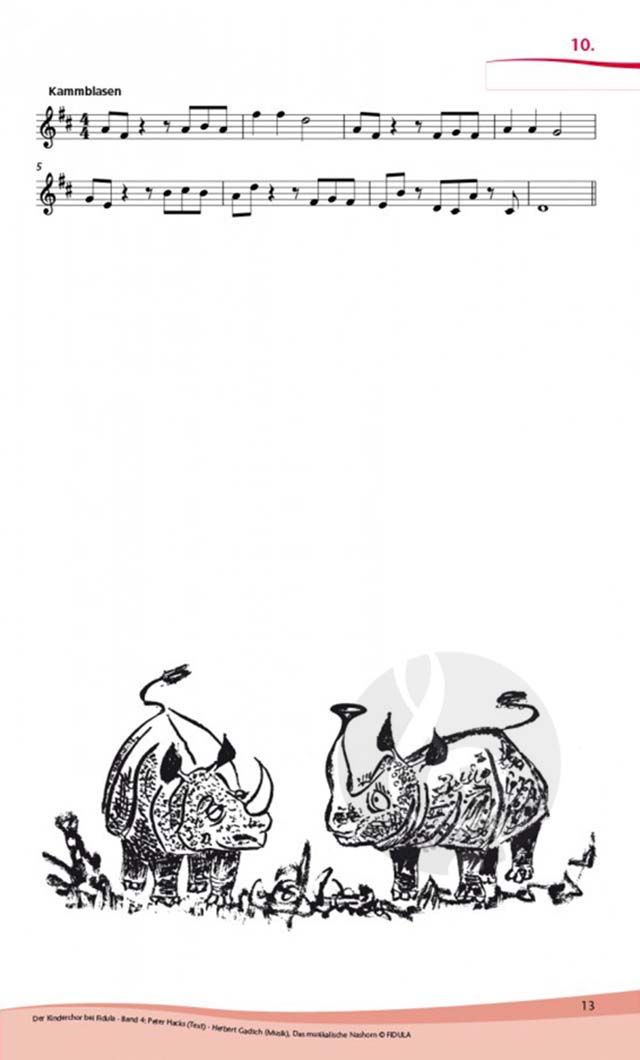 Die zeitlose Geschichte vom musikalischen Nashorn, das das bedrohliche Löwenrudel dazu bringt, von der friedlichen Nashornherde abzulassen und sich statt dessen der Kunst zu widmen, regt zu allerlei musikalischer Aktivität an. In diesem kleinen Singspiel agieren Chor und Sprecher zusammen mit Blockflöten, Trompete (oder Horn), Violine (oder Klarinette) und Kammbläsern. Dieses Heft enthält alle Texte und die Noten für Gesang und Instrumente sowie Extrastimmen für die transponierenden Bläser.