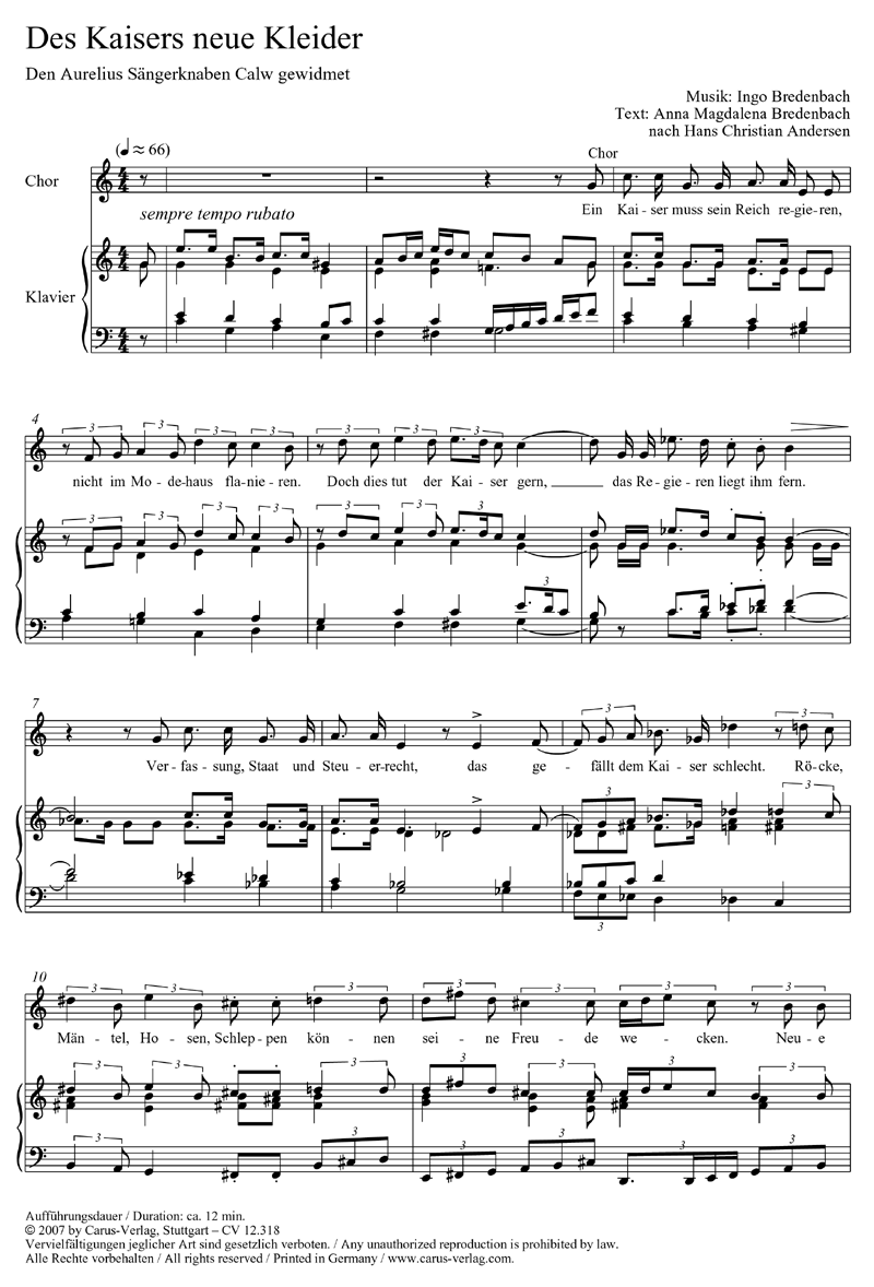 Musikalische Szene - Zum Hans-Christian-Andersen-Jahr entstand die Musikalische Szene 'Des Kaisers neue Kleider' als Auftragskomposition des amj. Anna Magdalena Bredenbach hat auf geist- und pointenreiche Weise das Märchen bereimt, Ingo Bredenbach eine kindgerechte Umsetzung in Musik komponiert. Die Partien des Singspiels 'Des Kaisers neue Kleider' sind in erster Linie für 1-2-stimmigen Kinderchor und Klavier konzipiert. Neben einer konzertanten ist auch eine szenische oder halbszenische Aufführung möglich. - 1-2stg Kinderchor, Soli, Pfte
