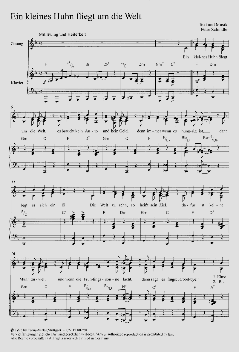 Die Songs für Kinder von Peter Schindler sind heitereTiergeschichten zum Singen. Sie können eine Musikstunde oder Chorprobe auflockern oder im Konzert (auch als Zugabe) einfach Spass machen. Sie lassen sich einzeln oder ,zyklisch' aufführen und auch szenisch darstellen. - Kinderchor 1-3stg, Klavier/Keyboard, Rhythmusgruppe