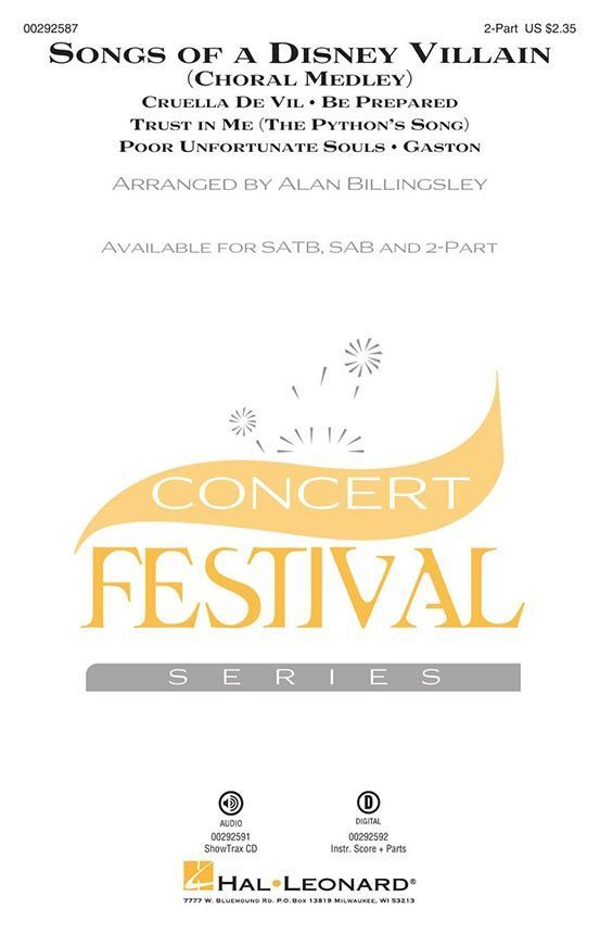 Every good story needs a good villain and Disney has created some of the best. Here are five great songs that are sung by the characters we love to hate--Cruella de Vil from 101 Dalmations, Gaston from Beauty and the Beast, the Python from The Jungle Book, Ursula from The Little Mermaid, and Scar from The Lion King.