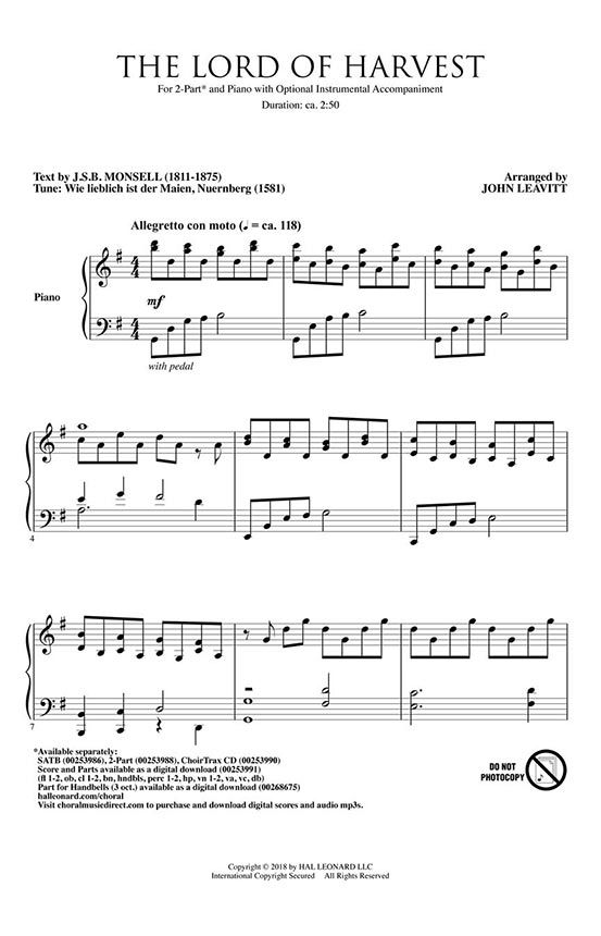 This hymn arrangement of Sing to the Lord of Harvest visits a traditional Thanksgiving text celebrating the bountiful provision that flows from the hand of God. All creation proclaims its praise in this dignified hymn known for its attractive melody and cheerful alleluias! Moments of sonorous chords feature the choir in deep expressivity contrasting with more thinly arranged sections with light counterpoint to provide sparkle and charm. A poised ending crowns the work with worship and praise! Score and Parts (fl 1-2, ob, cl 1-2, bn, hndbls, perc 1-2, hp, vn 1-2, va, vc, db) available as a digital download. Handbell part also available as a separate download.