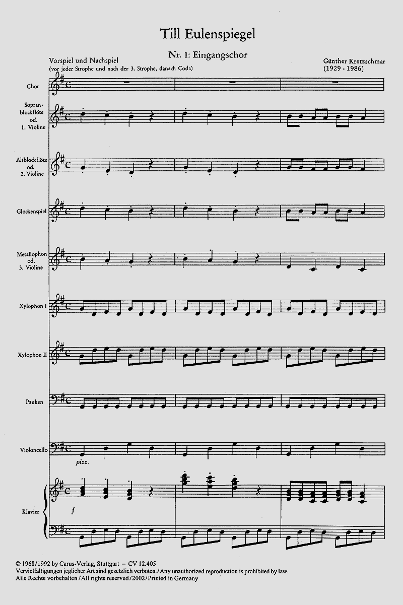 Kantate für Kinder - Wie die vielen anderen Stücke von Günther Kretzschmar im Carus-Verlag ist auch 'Till Eulenspiegel' so gestaltet, dass eine Darstellung des Stückes unter verschiedenen Voraussetzungen möglich ist. In jeglicher Hinsicht kann hier kreative Eigenarbeit eingebracht werden. Solo S, Kinderchor SSA, Spr, Timp, 2 Xyl, Metal, Blfl (c2, f1) (2 Vl), Glsp (Vl 3), Vc, Pfte