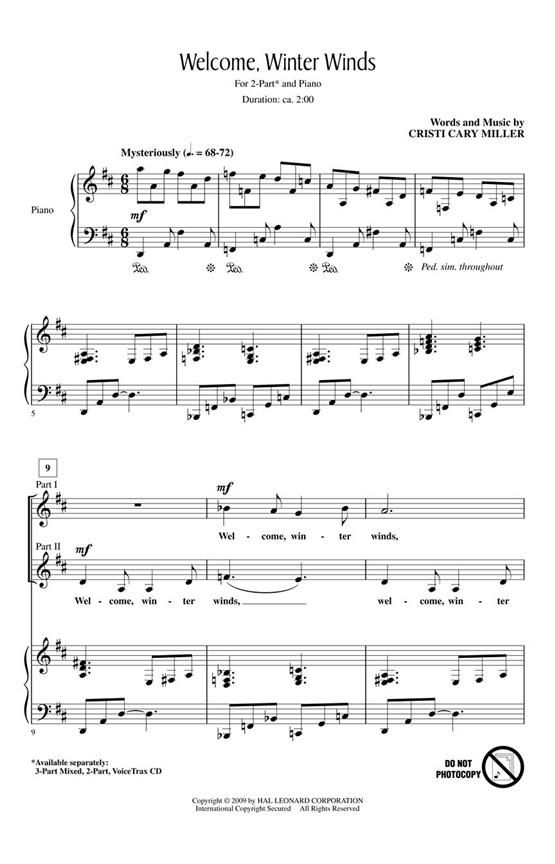 This original work evokes stunning scenes of the winter wind as it swirls, lifts and turns the feather-like snowflakes, causing them to dance upon the ground. It's a superb teaching piece for making the connection between the text and the music. Available separately: 3-Part Mixed, 2-Part, VoiceTrax CD. Duration: ca. 2:00.