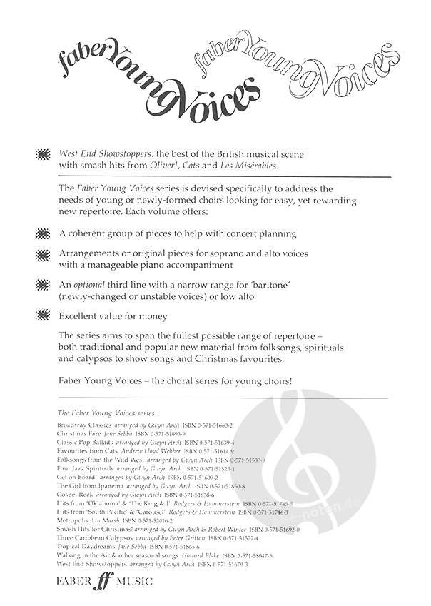 Diese beliebten Klassiker aus dem Londoner Westend wurden fachmännisch für junge oder sich entwickelnde Chöre arrangiert. Die Lieder sind einfach und machen Spaß zu singen und werden sicher ein Hit für viele junge Chöre sein. Die Arrangements von Gwyn Arch tragen der Natur junger Stimmen Rechnung, und der optionale Bariton wurde in einem relativ engen Bereich geschrieben, um frisch veränderte oder instabile Stimmen zu unterstützen.