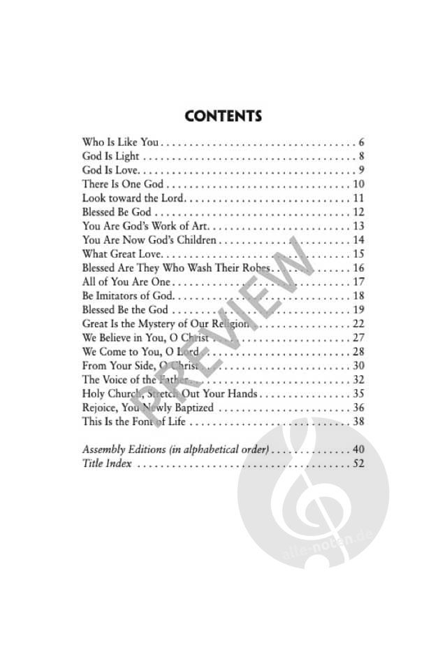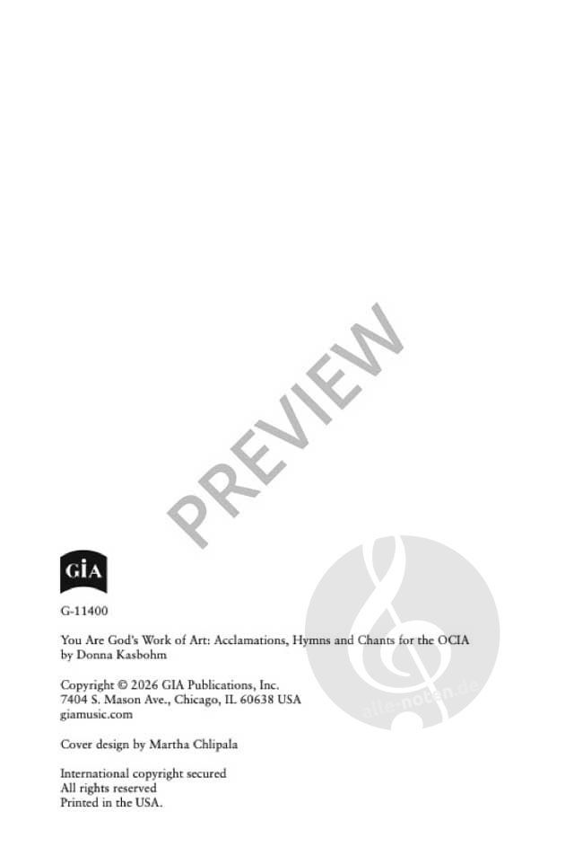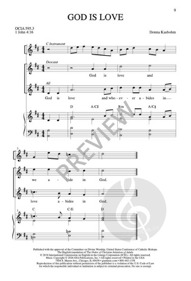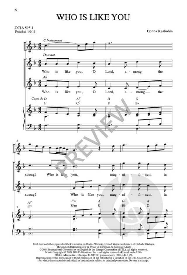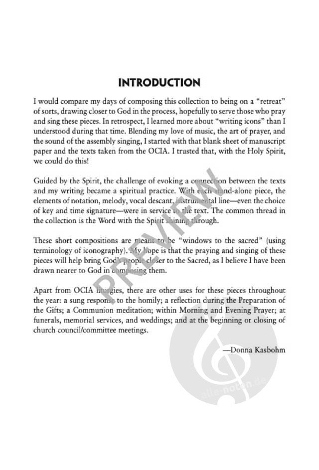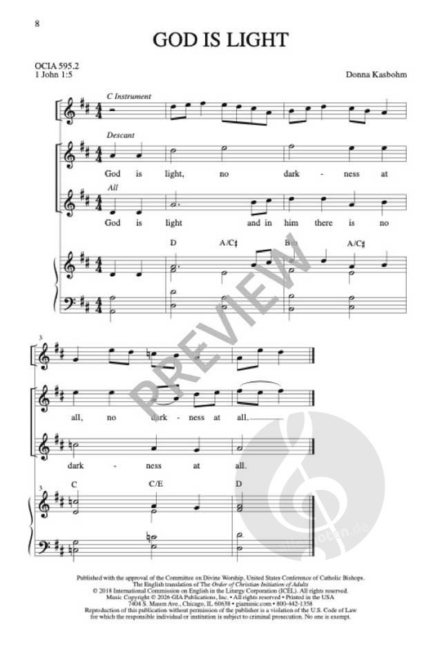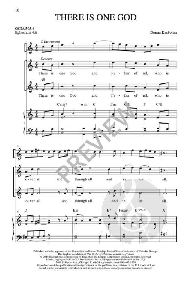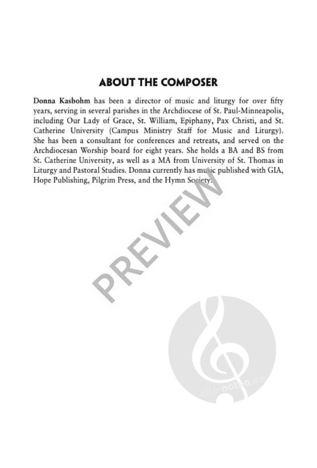 Donna Kasbohm hat die 21 Texte für den Orden der christlichen Initiation Erwachsener (OCIA) größtenteils für einstimmigen Gesang mit Diskant und Klavier- oder Orgelbegleitung mit einigen C-Instrumentenstimmen gesetzt. Alle sind sowohl für den Chor als auch für die Gemeinde leicht zu erlernen. Abgesehen von den OCIA-Liturgien sind diese Stücke das ganze Jahr über auf verschiedene Weise nützlich, z. B. als gesungene Antwort auf die Predigt, als Reflexion während der Gabenbereitung, als Abendmahlsmeditation, im Rahmen des Morgen- und Abendgebets, bei Beerdigungen, Gedenkgottesdiensten und Hochzeiten sowie zu Beginn oder zum Abschluss von Kirchenvorstands- und Ausschusssitzungen.