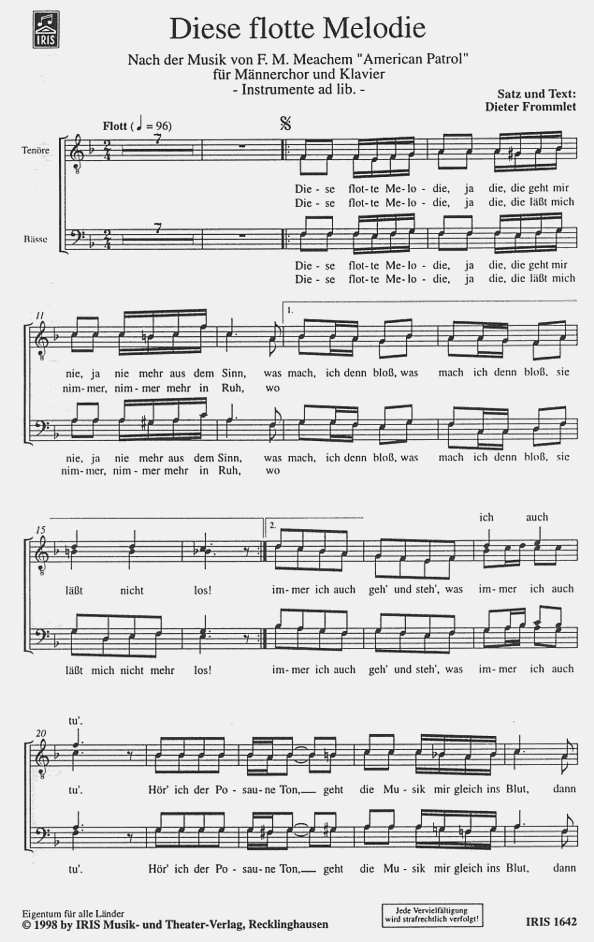 nach 'American Patrol' von F. W. Meachem für 4-stg. Männerchor und Klavier oder zus. mit Bass, Schlagzeug, Alt-Saxophon, Klarinette in B