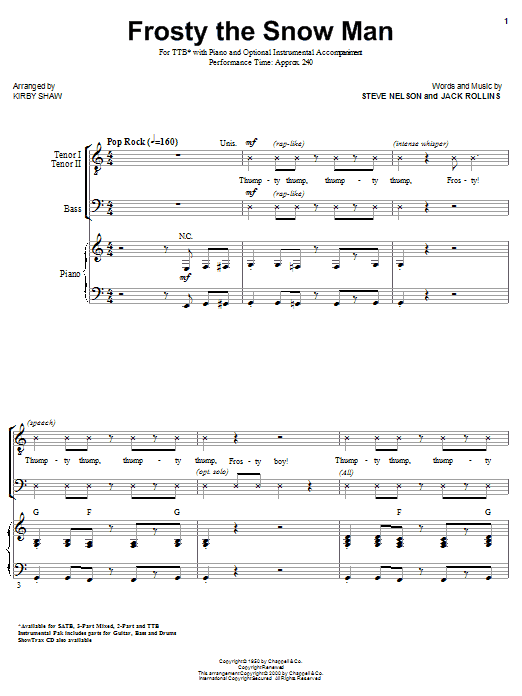 Now available for men! Frosty and friends come thumpity thumping right down to town - but with a little bit of a rock 'n' roll update. Zany and fun! Available for SATB, 3-Part Mixed, 2-Part, TTB, IPAK and ShowTrax CD. Performance Time: Approx. 2:40.