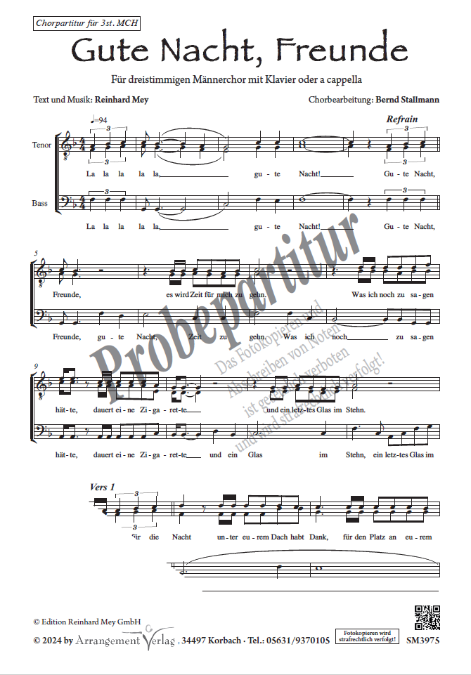 "Gute Nacht, Freunde" wurde von Alfons Yondraschek (Reinhard Mey) geschrieben. Mit diesem Lied nahmen Inga & Wolf am deutschen Vorentscheid des "Eurovision Song Contest" 1972 teil und erzielten einen vierten Platz. Erst danach wurde es von Reinhard Mey veröffentlicht. Dieses Chanson gehört mittlerweile zum deutschen Kulturgut und hat generationenübergreifend Kultstatus erlangt. In unserer Chorversion für dreistimmigen Männerchor ist der Titel sowohl a cappella als auch mit Klavier zu singen.