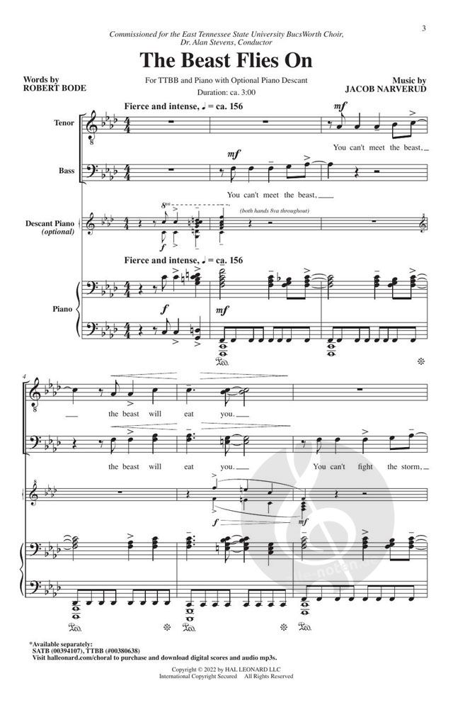 A fiery text by Robert Bode, an optional 'descant piano' and a fierce musical setting are the ingredients for a memorable tour de force for your men's choir.