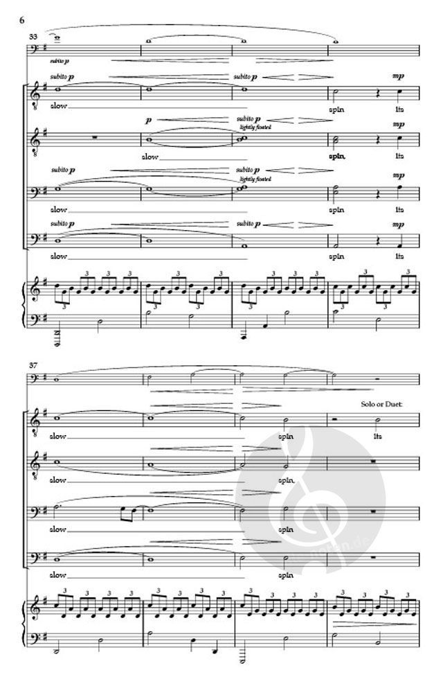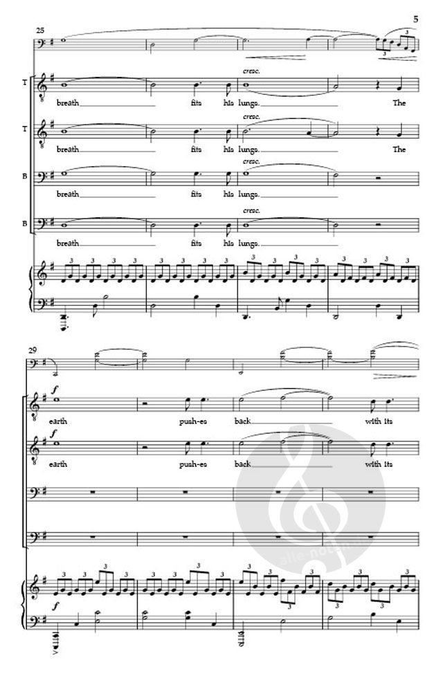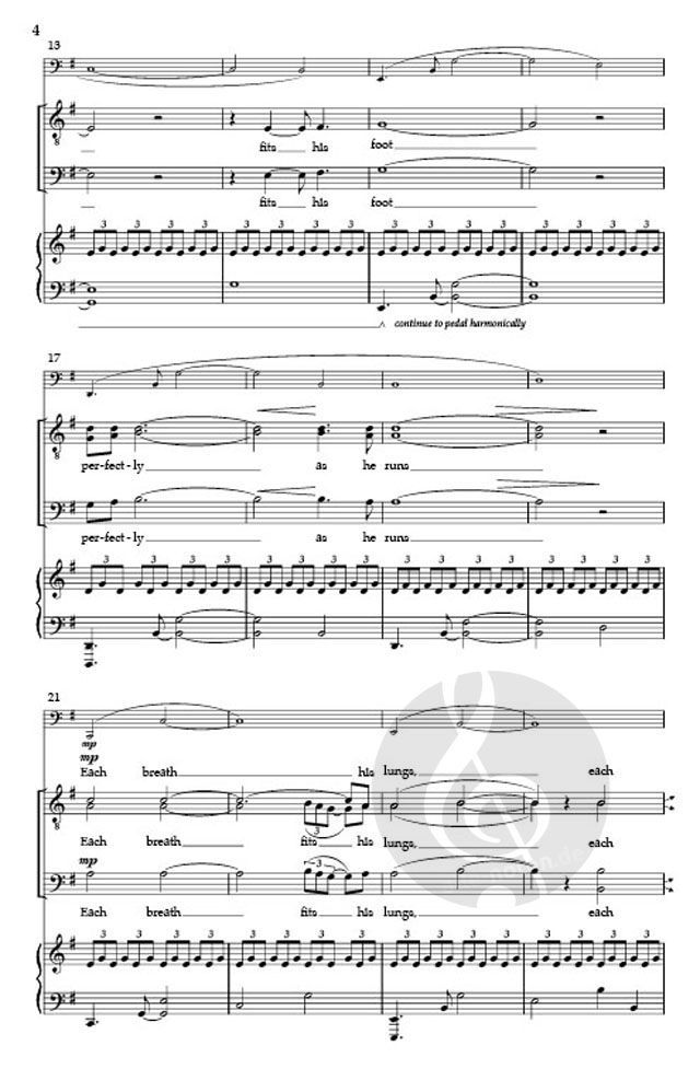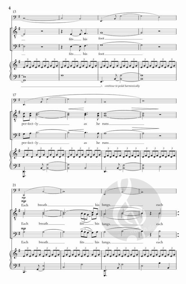A beautiful, driving piano accompaniment sets the stage for the journey of a runner - the air filling his lungs and the ground "pushing back with its slow spin." The ethereal voices paint a wondrous picture. A lovely work, not difficult, and perfect for high school singers and above. Andrew Crane Choral Series.