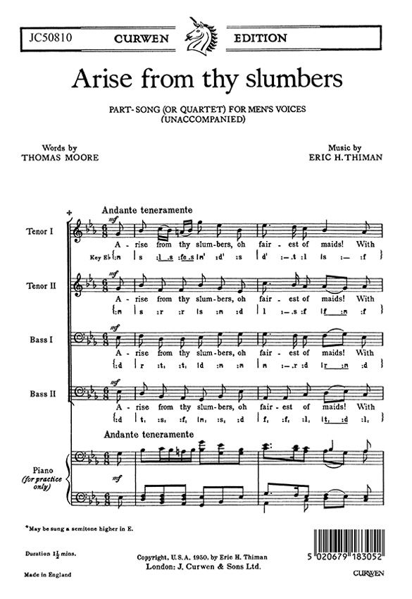 Thiman, E Arise From Thy Slumbers TTBB/Piano