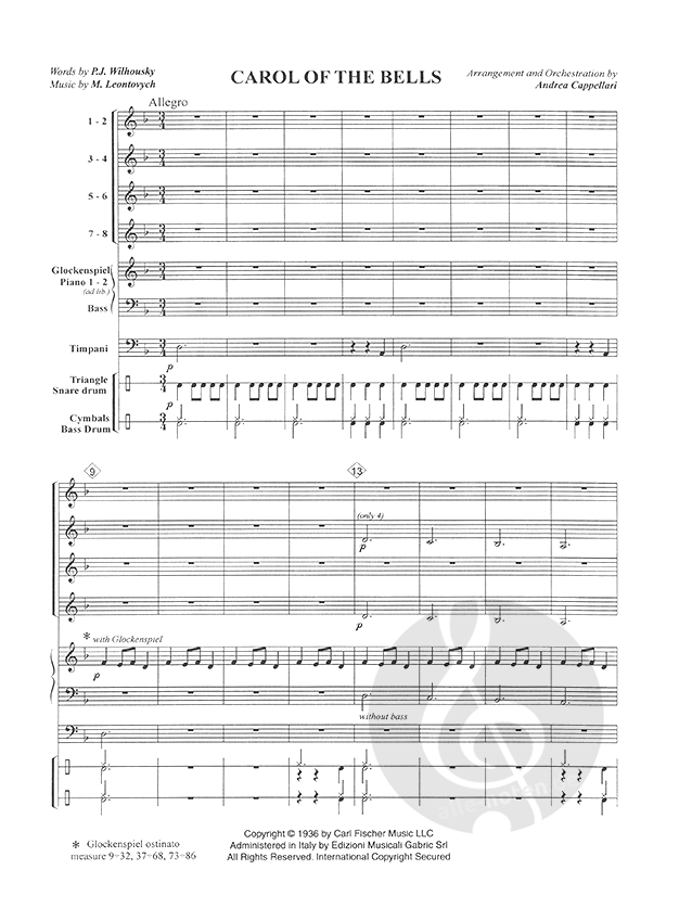 Carol Of The Bell: Full score and 24 parts: 1) C Instr. (Flute, Violin) / 1) Bb Instr. (Clarinet, Soprano Sax.) / 2) C Instr. (Flute, Violin, Oboe) / 2) Bb Instr. (Clarinet, Soprano Sax. , Trumpet) / 3) C Instr. (Violin, Viola) / 3) Bb Instr. (Clarinet, Soprano Sax. , Trumpet) / 4) C Instr. (Violin, Viola) / 4) Bb Instr. (Clarinet) / 5) C Instr. (Violin, Viola) / 5) Eb Instr. (Alto Sax.) / 6) C Instr. (Violin, Viola) / 6) Eb Instr. (Alto Sax.) / 7) C Instr. (Violin, Viola) / 7) Bb Instr. (Clarinet) / 7) Eb Instr. (Alto Sax.) / 8) C Instr. (Violin, Viola) / 8) Bb Instr. (Clarinet) / 8) Eb Instr. (Alto Sax.) / Piano 1 / Piano 2 / Timpani / Cymbals, Bass drum / Triangle, Snare drum / Four Hands Piano ad libitum. Performance possibile also without Piano.