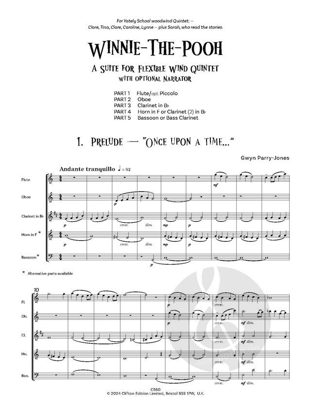 Die erste Ausgabe dieser Suite, die 1998 bei Phylloscopus Publications erschien, war für Flöte/opt. Piccoloflöte, Oboe, zwei Klarinetten und Fagott geschrieben, mit alternativen Stimmen für Horn in F (was die Aufführung durch ein Standardbläserquintett ermöglicht) und auch einer Bassklarinettenstimme als Alternative zum Fagott. Diese neue Ausgabe bietet das gleiche flexible Schema.