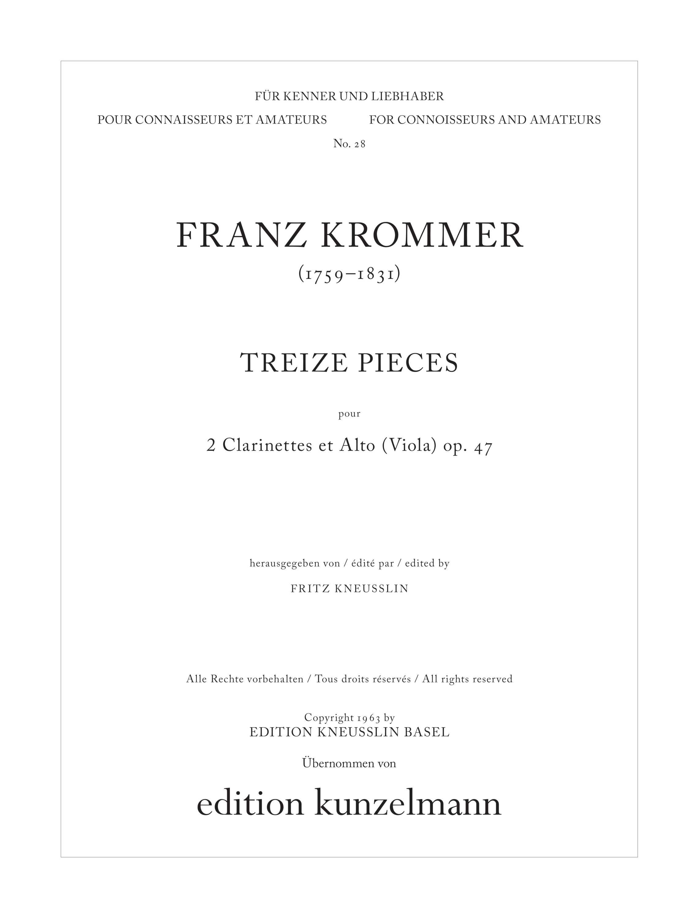 Franz KROMMER gehörte zu jenem Kreis böhmischer Komponisten, die die musikalische Entwicklung Europas im ausgehenden 18. und frühen 19. Jahrhundert beeinflussten. Schubert z.B. spielte Krommers Werke während seiner Internatszeit im k.k. Konvikt zu Wien. Die wenigen Neu-Ausgaben und das Studium der in fast allen Bibliotheken verstreuten Werke (Kirchenmusik, Symphonien, Konzerte, Kammermusik für Streicher und Bläser) lassen den Schluss zu, dass die Wiedererweckung von Krommers Schaffen im Konzertsaal und im Rahmen des häuslichen Musizierens von großem Gewinn ist. Für die vorliegende Ausgabe der 'Treize Pièces pour 2 Clarinettes et Alto' wurde der Druck des Bureau d'arts et d'industrie, Wien, vom Jahre 1804 verwendet. Zahlreiche Druckfehler wurden korrigiert; ebenso mussten die Phrasierungen im Sinne der heutigen Editionspraxis festgelegt werden. Bei vier Nummern fehlen im Original die näheren Tempobezeichnungen. Wir schlagen für Nr. 2 Allegro, Nr. 5 und 7 Allegretto und für Nr. 9 Allegro vor. Auf die Vermehrung der spärlichen dynamischen Angaben wurde absichtlich verzichtet, um dem 'Kenner und Liebhaber' Gelegenheit zu einer eigenen Differenzierung zu geben. Fritz Kneusslin