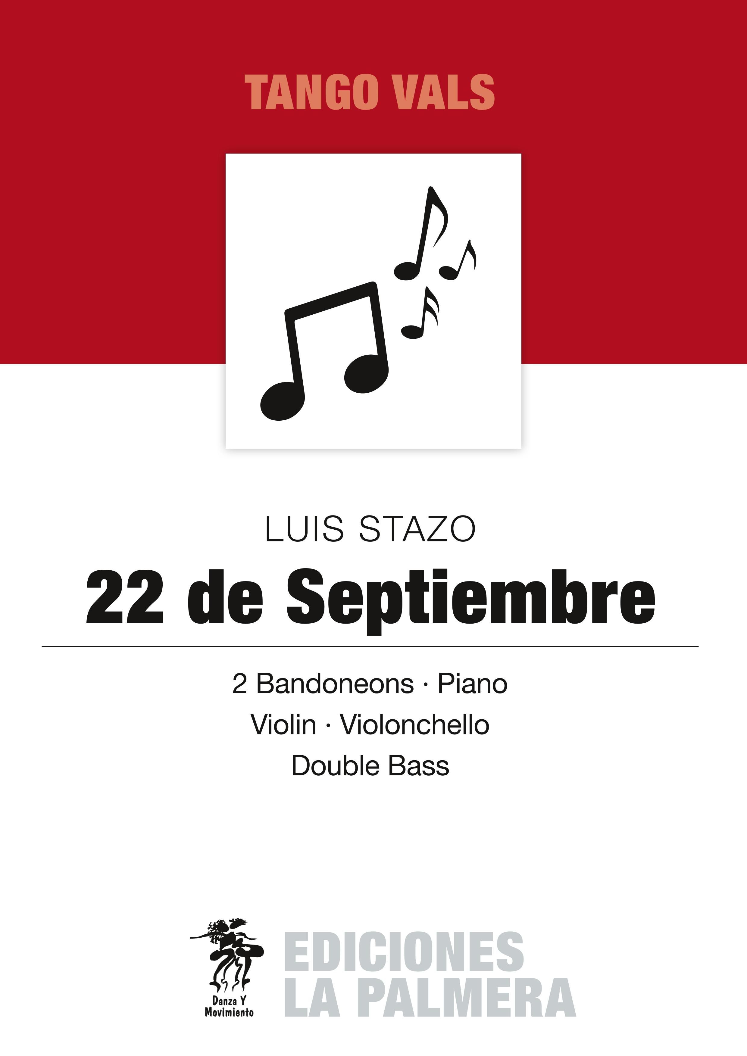 Diese Ausgabe enthält die Originalnoten des Musikstückes "22 de Septiembre" von Luis Stazo. Die Ausgabe enthält die Partitur und Einzelstimmen für 2 Bandoneons, Klavier, Viloin, Violoncello und Kontrabass. Mittlerer Schwierigkeitsgrad in B-Dur.