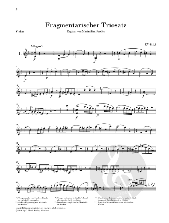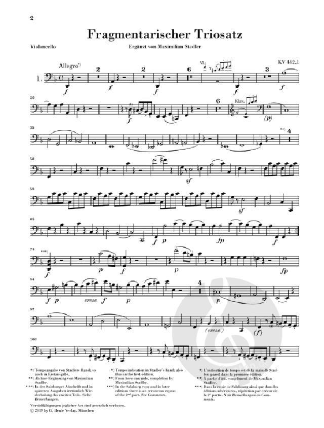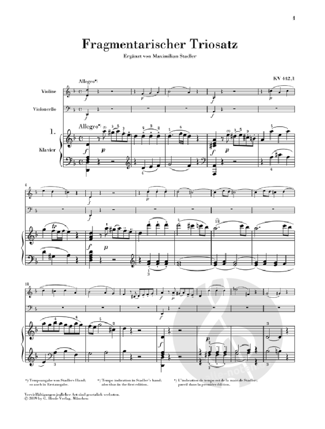 Mozart hat immer wieder Kompositionen begonnen und dann nicht abgeschlossen. Manche dieser Fragmente überliefern äußerst wertvolle Musik - wie die hier vorgestellten drei Klaviertrio-Fragmente eindrücklich belegen. Sie wurden von Mozart zu unterschiedlichen Zeiten als Einzelsätze geschrieben. Trotzdem fasste die postume Erstausgabe sie zu einem vermeintlich neuen, unbekannten Klaviertrio Mozarts zusammen, weshalb sie im Köchelverzeichnis die gemeinsame Nummer 442 erhielten. Basis der Erstausgabe sind die stilistisch sicheren, allerdings wenig originellen Ergänzungen des Mozart-Freundes Abbé Maximilian Stadler. Die Henle-Urtextausgabe bietet neben diesen zusätzlich neu komponierte, sehr lohnende Ergänzungen von Robert D. Levin.