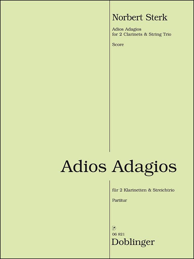 'In Adios Adagios bestimmen die ersten vier Töne des C-Dur-Quartetts KV 465 ('Dissonanzenquartett') nahezu die gesamte harmonische Landschaft. Aus dieser Landschaft bricht Mozarts Musik wie aus tiefer gelegenen Schichten, gleich archeologisch freigelegten fremdartigen Ruinen und exotisch leuchtenden Mosaiken oder wie Erinnerungsfetzen, die aus einem brüchig gewordenen Untergrund hervorquellen ... Adios Adagios ist in drei Teile gegliedert, die ineinander übergehen und wie ein einziger Satz wirken.[KV 376, KV 515c, KV515a]' (a.d. Vorwort v. Komponisten)
