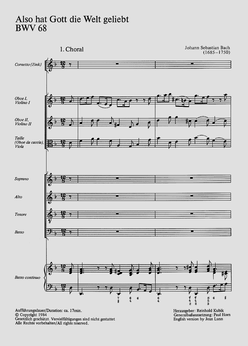 - Besetzung Soli, Gemischter Chor (SATB), 2 Oboen, Englischhorn, Trompete, 3 Posaunen, 2 Violinen, Viola und Orgel