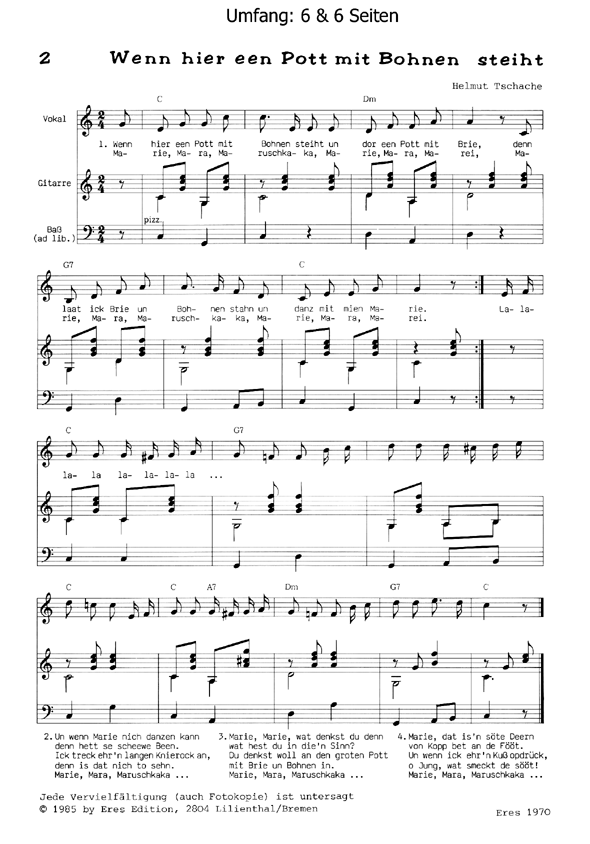 Niederdeutsche Lieder und Tänze für Singstimme, durchkomponierte Violine, Gitarre, Bass ad lib.