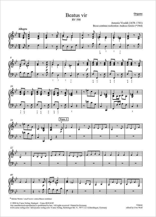 Dreimal hat Antonio Vivaldi Psalm 111 (112) "Beatus vir" vertont ("Wohl dem Manne, der den Herrn fürchtet"). Davon sind zwei erhalten, die unterschiedlicher kaum sein könnten: das umfangreiche, doppelchörig angelegte Werk RV 597 (Carus 40.012/00) und die kleine, aber feine und wirkungsvolle Vertonung RV 598. Vivaldi komponierte letztere für seine Schülerinnen am venezianischen Ospedale della Pietà. Die Urtext-Ausgabe dieses Werkes beruht auf Vivaldis Autograph. Das etwa achtminütige Stück in moderatem Schwierigkeitsgrad zeichnet sich durch einen reizvollen Wechsel zwischen chorischen Abschnitten und Solopartien aus – mal erklingt ein Alt-Solo, mal ein Duett zweier Soprane, mal der Chor. Besonders bemerkenswert ist der weitgehende Verzicht auf den Generalbass in den Solopassagen, was ihnen eine schwebende, ätherische Klangwirkung verleiht. Die im Psalm angelegte Gegenüberstellung des "Gottlosen" und des "Gottesfürchtigen" setzt Vivaldi musikalisch kontrastreich um. Den Abschluss bildet eine jubelnde Doxologie, die dem Werk einen würdigen Höhepunkt verleiht. Mit sparsamen musikalischen Mitteln gelingt dem Komponisten eine eindrucksvolle und abwechslungsreiche Auslegung des Psalmtextes.