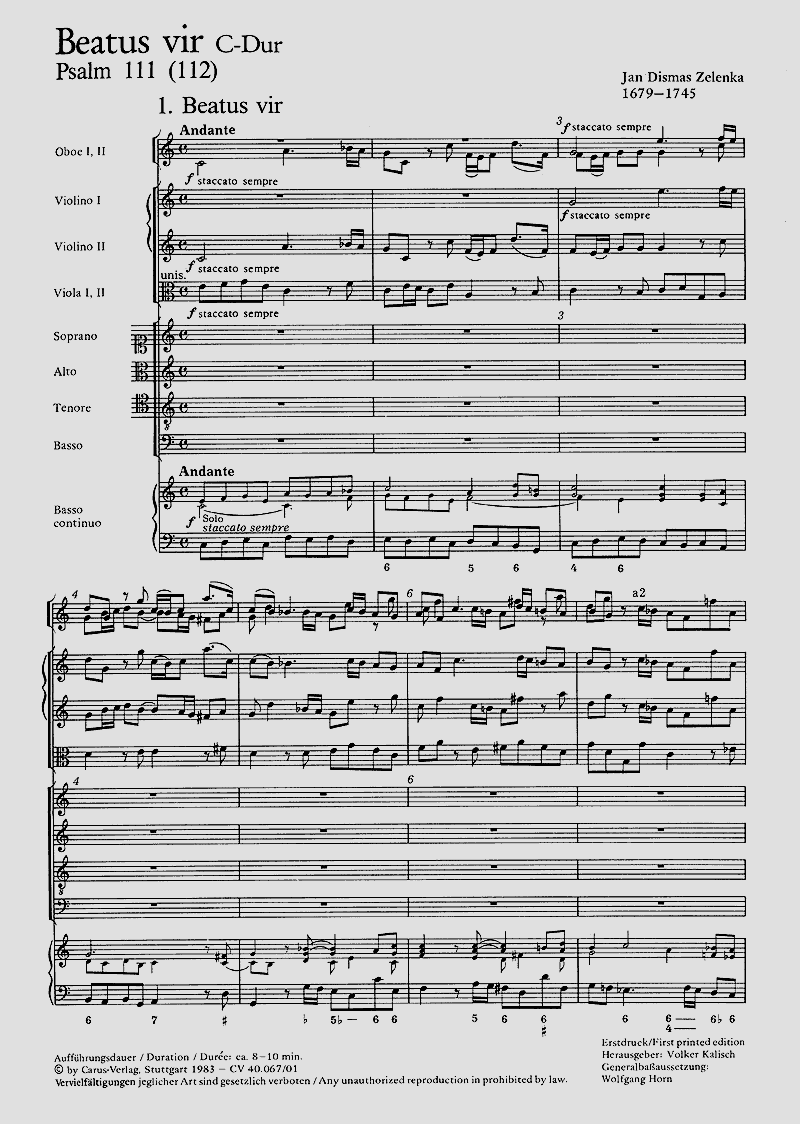Neben den über zwanzig Messen Zelenkas, die zweifellos im Zentrum seines Schaffens stehen, sind wohl vor allem seine dreissig Psalmvertonungen von besonderer Bedeutung als in sich geschlossene, zum Teil mehrsätzige Zyklen. In ihnen spiegeln sich der ganze Reichtung und die Vielfalt von Zelenkas Kunst, ihn ihnen wender er alle Techniken und Satzweisen seiner Zeit an. Soli STB, Coro SATB, 2 Ob, 2 Vl, 2 Va, Bc