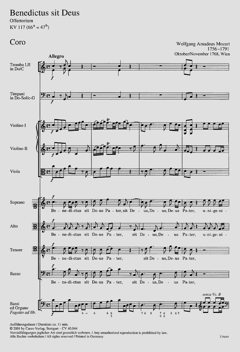Wolfgang Amadeus Mozarts Offertorium 'Benedictus sit Deus' entstand wahrscheinlich während eines längeren Aufenthalts in Wien zur Einweihung der dortigen Waisenhauskirche am Rennweg, die am 7. Dezember 1768 stattfand. - Solo S, Coro SATB, 2 Fl, 2 Cor, 2 Tr, Timp, 2 Vl, 2 Va, Vc/Fg/Cb, Org