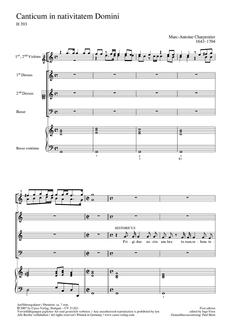 Marc-Antoine Charpentier ist nicht nur der Erfinder der Eurovisions-Melodie, sondern hat durch Oratorien, Motetten und Kantaten wesentliche Beiträge zur französischen Sakralmusik des Barocks geschaffen. Vier seiner Weihnachtsmusiken (CV 21.019-21.022) erscheinen nun bei Carus in Erstausgaben. Den lateinischen Texten für Weihnachten, Neujahr, Epiphanias und Mariä Reinigung (Lichtmess) liegen die entsprechenden Evangelienberichte in Form poetischer Paraphrasen zugrunde. Die musikalische Gestaltung folgt - ähnlich wie in Charpentiers umfangreicheren Histoires sacrées - dem oratorischen Stil, mit rezitativischer Evangelistenpartie und direkten Reden der biblischen Personen und Personengruppen (Engel, Herodes, Hirten, Weise aus dem Morgenland). Die Vokalbesetzung verlangt nur jeweils zwei Soprane und Bass, die in den mehrstimmigen Partien sowohl chorisch als solistisch ausgeführt werden können. Nicht zuletzt diese einheitliche Besetzung legt eine zyklische Aufführung als kleines 'Weihnachtsoratorium' nahe. - Coro SSB, 2 Vl, Bc