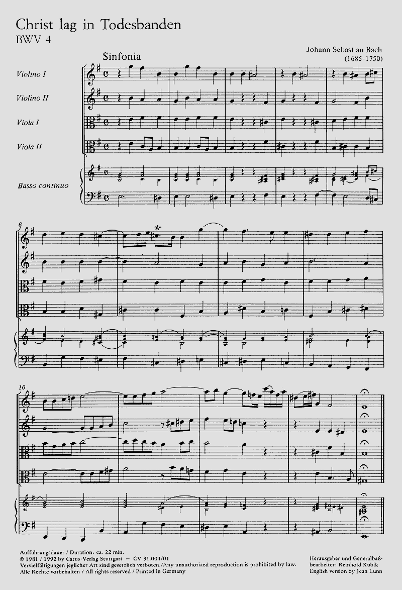 Soli SATB, Coro SATB, [Cto, 3 Trb] (Chorduplierung), Str (2 Va), Org. Kantate zum Osterfest (Frühfassung) - Die Kantate 'Christ lag in Todesbanden' gehört zu den frühesten Vokalkompositionen, die von Bach erhalten sind. Der Text beruht auf dem gleichnamigen Osterchoral von Martin Luther.