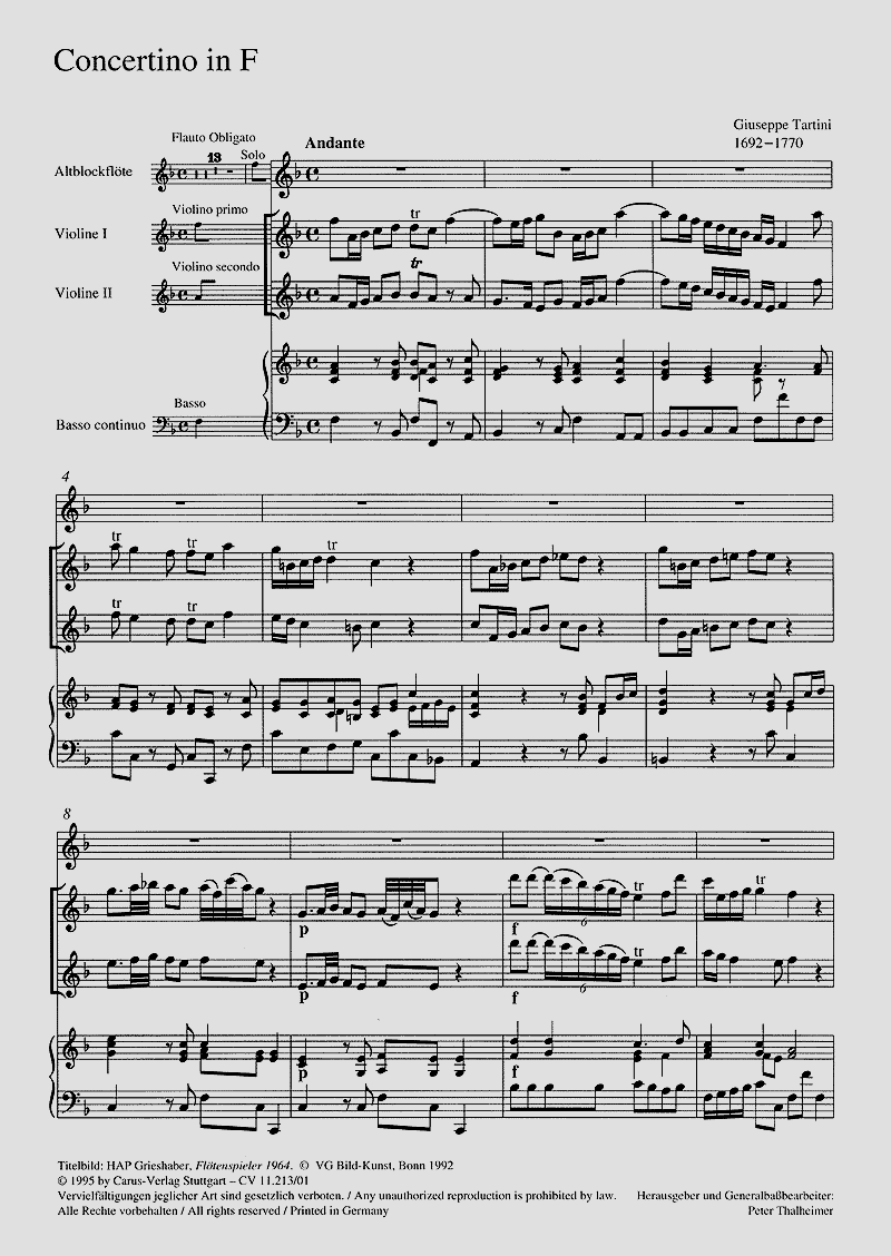 Peter Thalheimer ist der Herausgeber eines unbekannten Concertino von Giuseppe Tartini, das der Gattung 'Concerto da camera' angehört. Dieses Stück ist stilistisch mit der Musik von A. Scarlatti und A. Vivaldi vergleichbar. - Blfl f1, 2 Vl, Bc