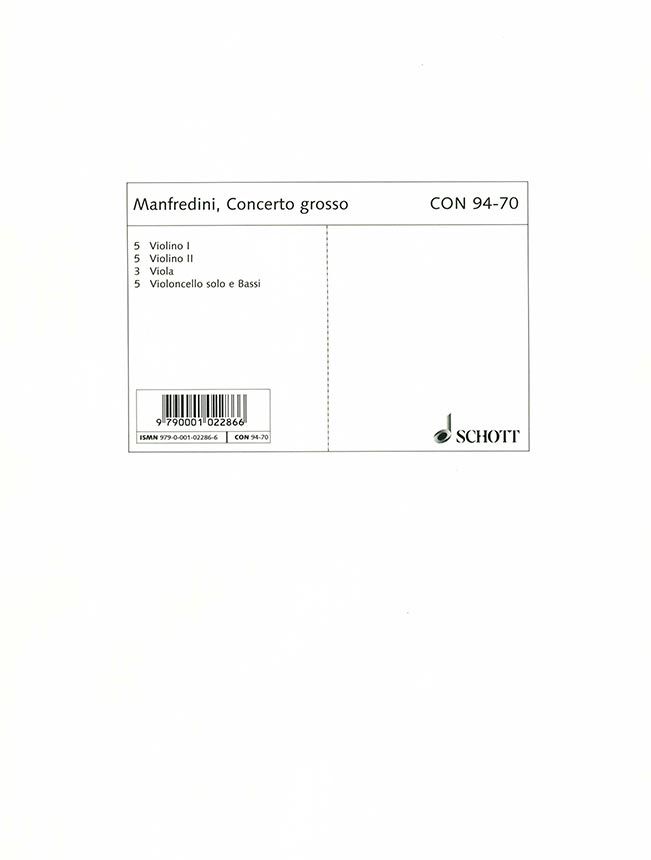 Zu besonderer Popularität gelangt ist das 'Weihnachtskonzert' in C-Dur, das eine Tradition aufgreift, die Corelli mit seiner Pastorale am Ende von op. 6 Nr. 8 oder Torelli in seinem op. 8 Nr. 6 pflegte und die weiter reicht bis zur Pastorale in Händels 'Messias' und zur Sinfonia in der 2. Kantate von Johann Sebastian Bachs Weihnachtsoratorium. Letztlich geht das zurück auf das Musizieren von Hirten, die aus den Abruzzen und aus Kalabrien zu Weihnachten nach Rom kamen, um dort auf Schalmei und Dudelsack vor den Krippen zu spielen. Daher die volkstümlichen Terzenparallelen und die lang gehaltenen Basstöne, wie sie das erste 'Largo', ein echtes Siciliano im wiegenden typisch punktierten 12/8 Takt, charakterisieren. Stimmensatz - 5 V I [solo und tutti], 5 V II [solo und tutti], 3 Va, 5 Vc/Kb - 2 Violinen, Violoncello, Streichorchester und Cembalo