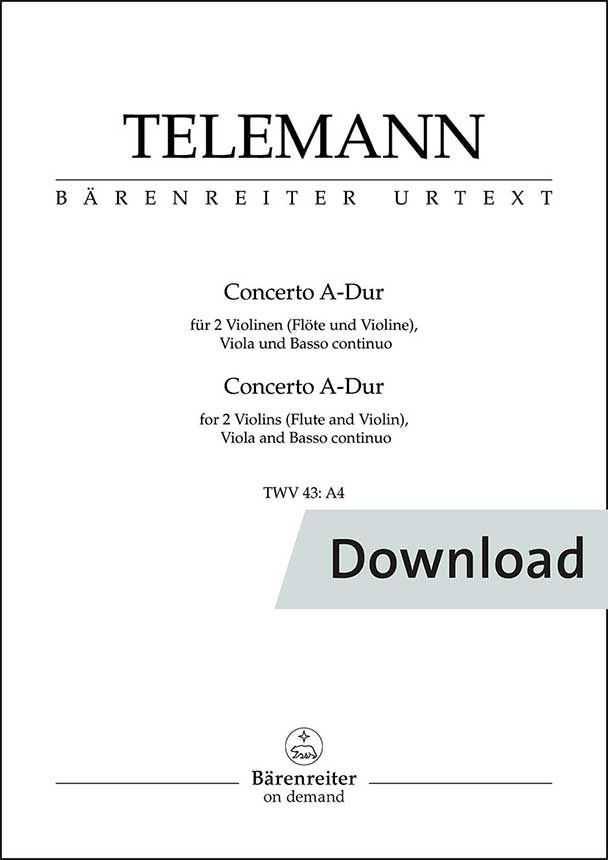 Das Anfang des 18. Jahrhunderts entstandene Concerto A-dur gehört einer Gruppe von Kompositionen Telemanns für zwei Violinen, Viola und Basso continuo an, die bisher von Musikforschung und -praxis weitgehend unbeachtet blieben. Vielleicht liegt der Grund hierfür in der Bezeichnung "Concerto", denn die dominierende Solopartie fehlt diesen Werken. Es handelt sich vielmehr um "Concerti a quattro" oder "Concerti ripieni". Diese Ausgabe enthält sowohl die originale Fassung für Streicher als auch - gekennzeichnet durch ossia-Stellen - die ursprünglich für authentisch gehaltene Fassung für Flötenquartett, die ein Pariser Druck von 1752 überliefert. Mit dem Urtext der Telemann Werkausgabe erschließt diese Ausgabe eine neue Richtung des Kammermusikschaffens Georg Philipp Telemanns.