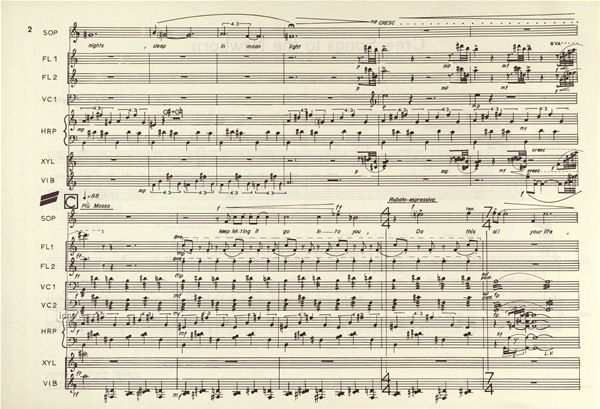 - Besetzung Gesang (hoch), 2 Querflöten, 2 Celli, 2 Percussion, Kontrabass, Celesta, Harfe und 2 Schlagzeuge