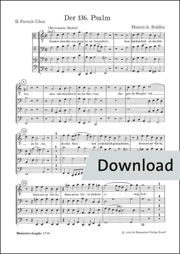 Psalm 136 aus Psalmen Davids für 2 Favoritchöre (SSAT+T[A], 3 Pos), Capellchor und Instrumente. Urtext der Neuen Schütz-Ausgabe. Sopran solo (2), Alt solo, Tenor solo (2), Trompete (3), Posaune (3), Pauke, Basso continuo. Chorpartitur/ Spielpartitur Tenor/ Alt solo, Posaune (3)