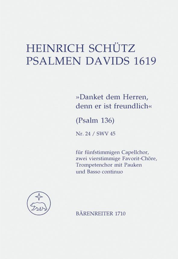 Psalm 136 aus Psalmen Davids für 2 Favoritchöre (SSAT+T[A], 3 Pos), Capellchor und Instrumente. Urtext der Neuen Schütz-Ausgabe. Sopran solo (2), Alt solo, Tenor solo (2), Trompete (3), Posaune (3), Pauke, Basso continuo