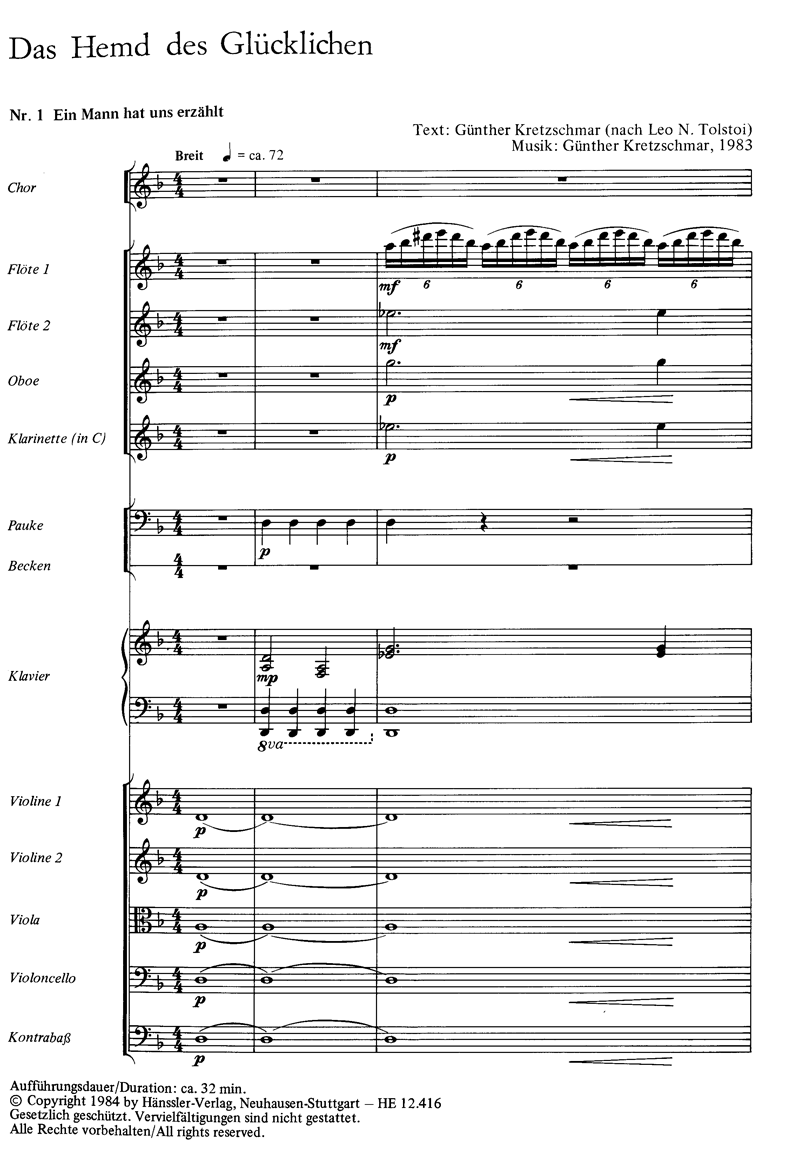 - Besetzung Soli, Kinderchor, 2 Querflöten, Oboe, Klarinette, Percussion, Streicher und Klavier