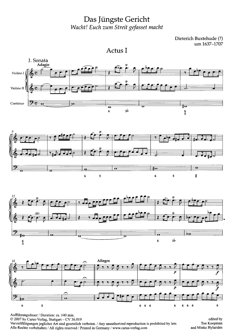 Wacht! Euch zum Streit gefasset macht - Vieles spricht dafür, dass es sich bei dem anonym überlieferten Oratorium Wacht! Euch zum Streit gefasset macht, bekannt auch unter dem Namen Das Jüngste Gericht, um die einzige erhaltene Abendmusik Dieterich Buxtehudes handelt, die dieser für die Lübecker Marienkirche komponierte und vermutlich um 1683 aufführte. Die vorliegende Edition macht das abendfüllende, in Stil und Handlung kontrastreiche Werk erstmals in seiner originalen Gestalt wieder aufführbar, wobei in der Quelle fehlende Stimmen vom Herausgeber Ton Koopman rekonstruiert wurden. - Soli SSSATB, Coro SSATB, 2 Vl, 2 Va, Bc, [2 Trb]