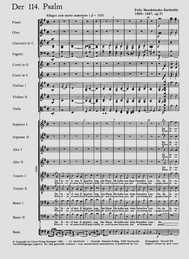 Psalmtexte inspirierten Mendelssohn während seines ganzen Schaffens, und er hinterliess neben A-cappella-Sätzen fünf große Orchesterpsalmen. Eines der eindrucksvollsten Werke ist sicher der monumentale Psalm 114, durchgängig für 8stimmigen Chor und ohne Solopartien gehalten. - Coro SSAA/TTBB, 2 Fl, 2 Ob, 2 Clt, 2 Fg, 4 Cor, 2 Tr, 3 Trb, Timp, 2 Vl, Va, Vc, Cb