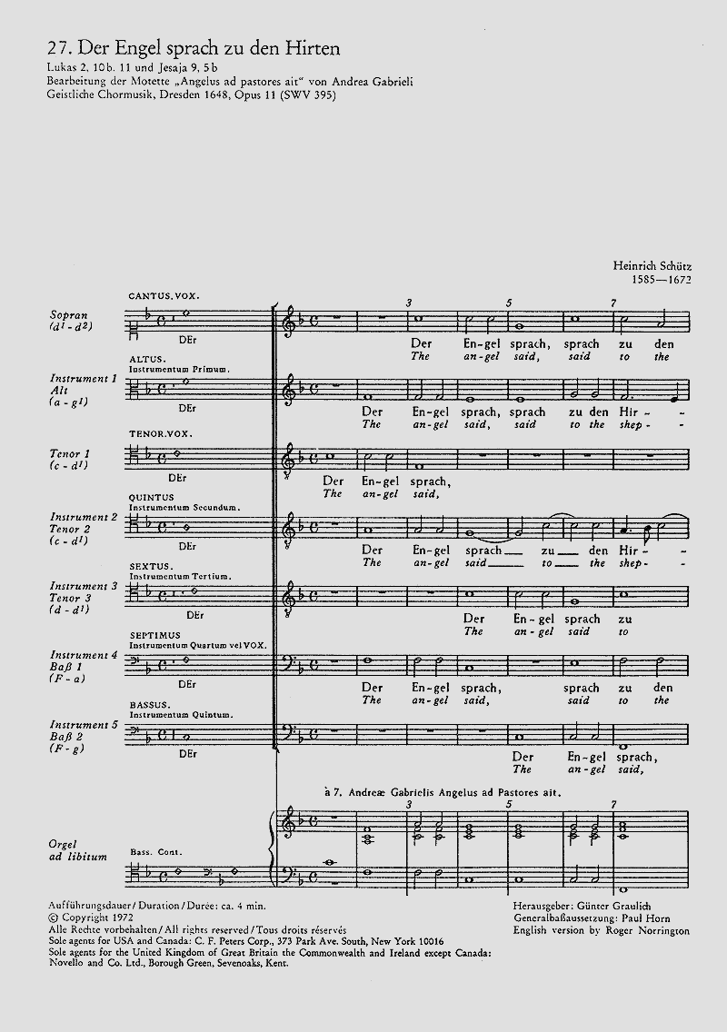 Bearbeitung der Motette Angelus ad pastores ait von Andrea Gabrieli mit singbarer englischer Übersetzung - Fav ST, 5 Instr (Coro ATTBB), [Cb, Org]