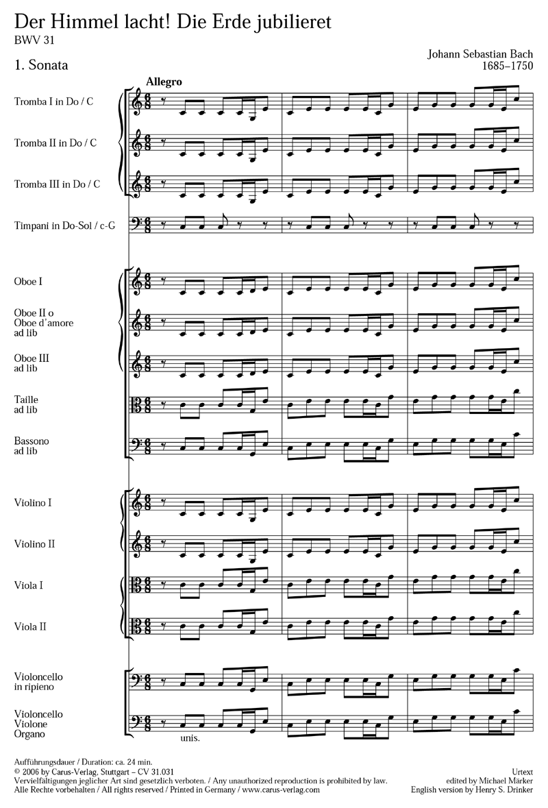 - Besetzung Soli, Gemischter Chor (SSATB), Oboe, 3 Trompeten, Pauke, 2 Violinen, 2 Violen und Basso Continuo