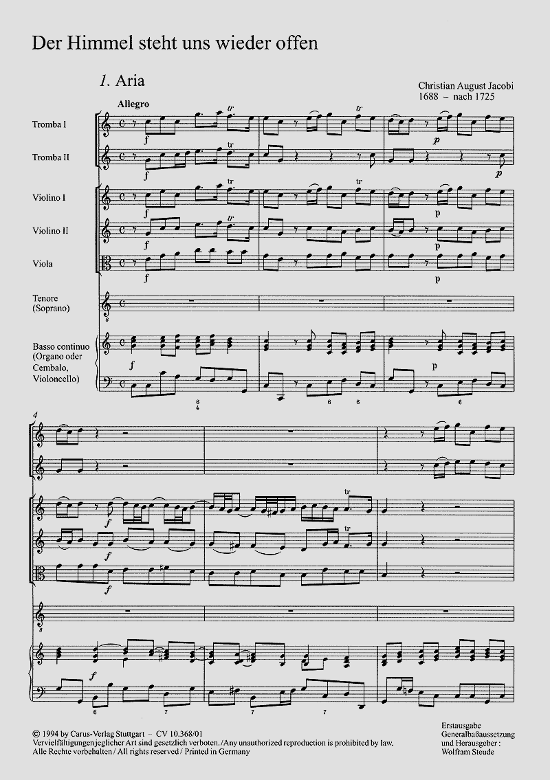 - Besetzung Gesang (hoch), 2 Trompeten, 2 Violinen, Viola und Basso Continuo