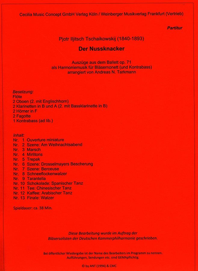 - Querflöte, 2 Oboen, 2 Klarinetten, 2 Fagotte und 2 Hörner