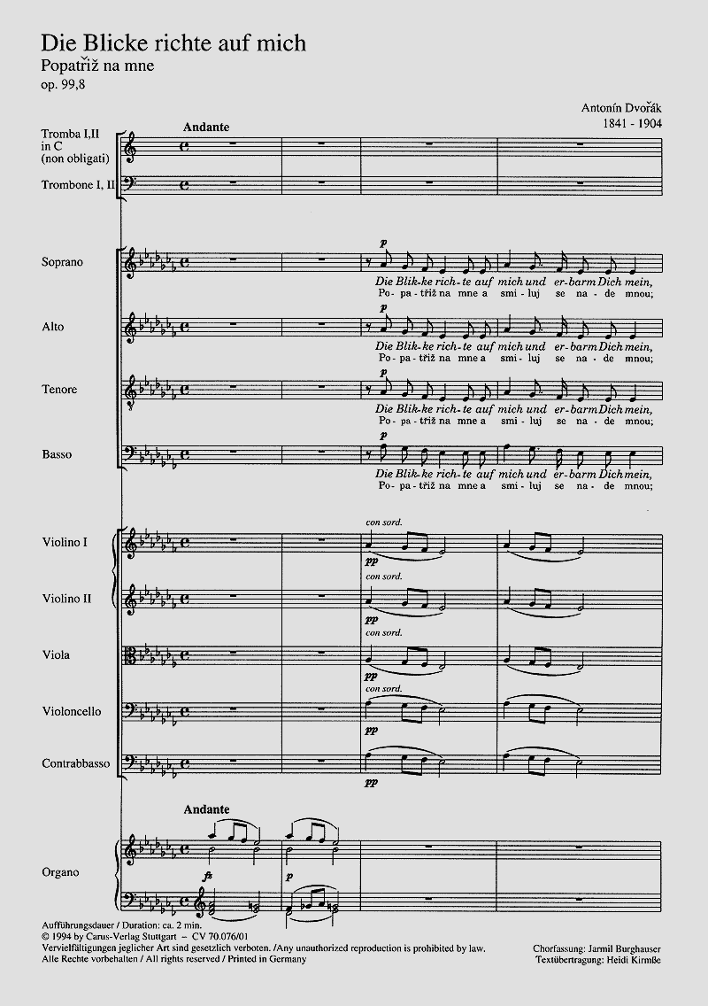 Die 'Biblischen Lieder' op. 99 entstanden während Dvorßks Aufenthalt in den Vereinigten Staaten. Diese Zeit von 1892 bis 1895 brachte dem Komponisten triumphale Erfolge und begründete seinen Weltruhm. Sie war aber andererseits auch von schweren psychischen Bealstungen bestimmt, die Dvorßk zu ertragen hatte. So führte die lange Abwesenheit von seiner Heimat zu einem sich verstärkenden Heimweh. Die Lieder sind in ihrer Schlichtheit der Faktur, dem Fehlen jeglicher Künstlichkeit sowie im freien Fluss unmittelbarer Inspiration Ausdruck dieser besonderen psychischen Situation des Komponisten. - Coro SATB, 2 Tr, 2 Trb, 2 Vl, Va, Vc, Cb, Org