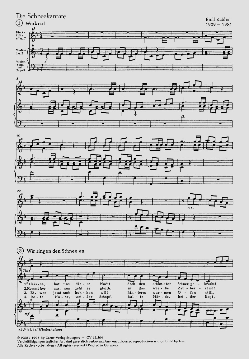 - Besetzung Kinderchor, Orff-Instrument, 2 Violinen, Cello und 2 Blockflöten