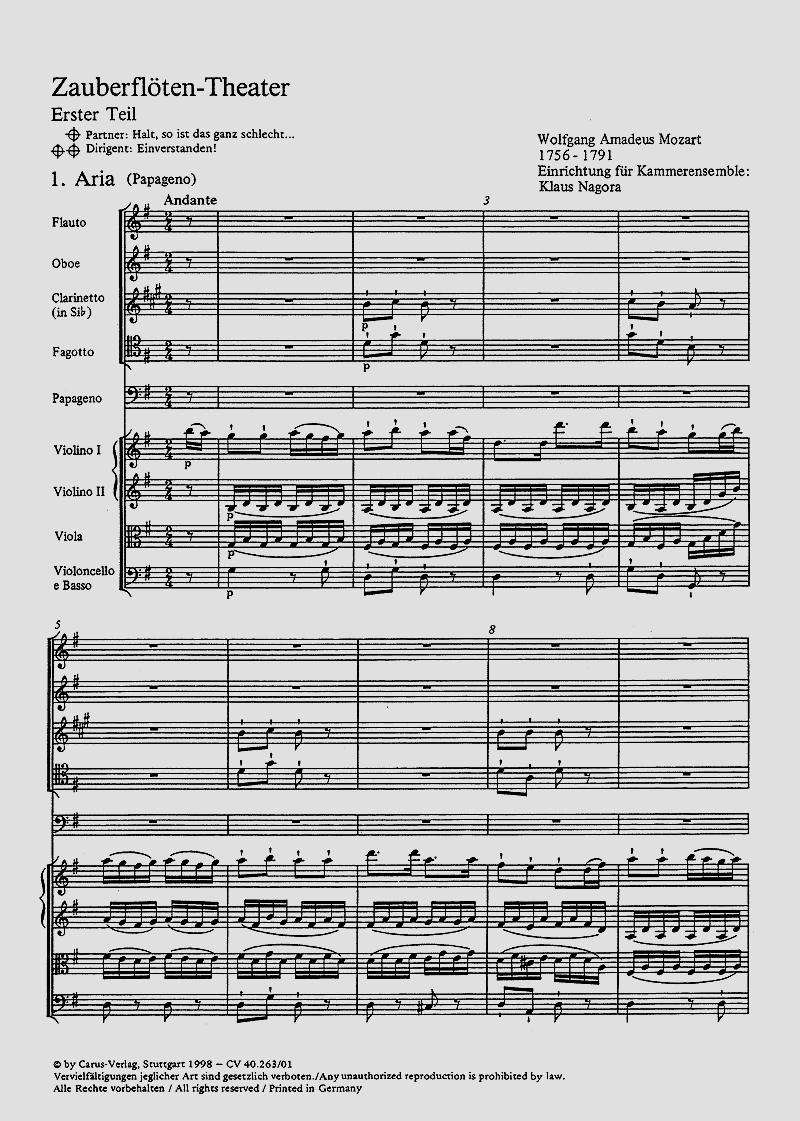 Mozarts 'Zauberflöte' trägt bei Carus den Titel 'Die Zauberflöte für Kinder'. Eine ursprünglich von Christian Boesch stammende Fassung - 'Zauber(flöten)reich Theater' - hat Klaus Nagora für 9 Singstimmen und 9 Instrumente bearbeitet. Obwohl Kürzungen vorgenommen wurden (Gesamtdauer inkl. Pause 110 Min.), blieb der originale Notentext aber weitgehend erhalten. Jungen Sängerinnen und Sängern soll in gekürzten Rollen die Möglichkeit gegeben werden, auch ausserhalb der Hochschule aufzutreten und dabei ein jugendliches Publikum, das nicht so leicht den Weg in die Oper findet, anzusprechen. Das Ergebnis ist eine offene Theaterform, die es erlaubt, je nach Besetzungsmöglichkeit und persönlichem Geschmack mehr oder weniger Musiknummern zu verwenden oder z. B. auch ganze Szenen mit Dialogen einzuschieben. Fantasie und freie, auch ganz unkonventionelle Kreativität sind für Regie, Bühne und Kostüme einzubringen. Soli SSSSSTTBB, Fl, Ob, Clt, Fg, Glsp, 2 Vl, Va, Vc/Cb