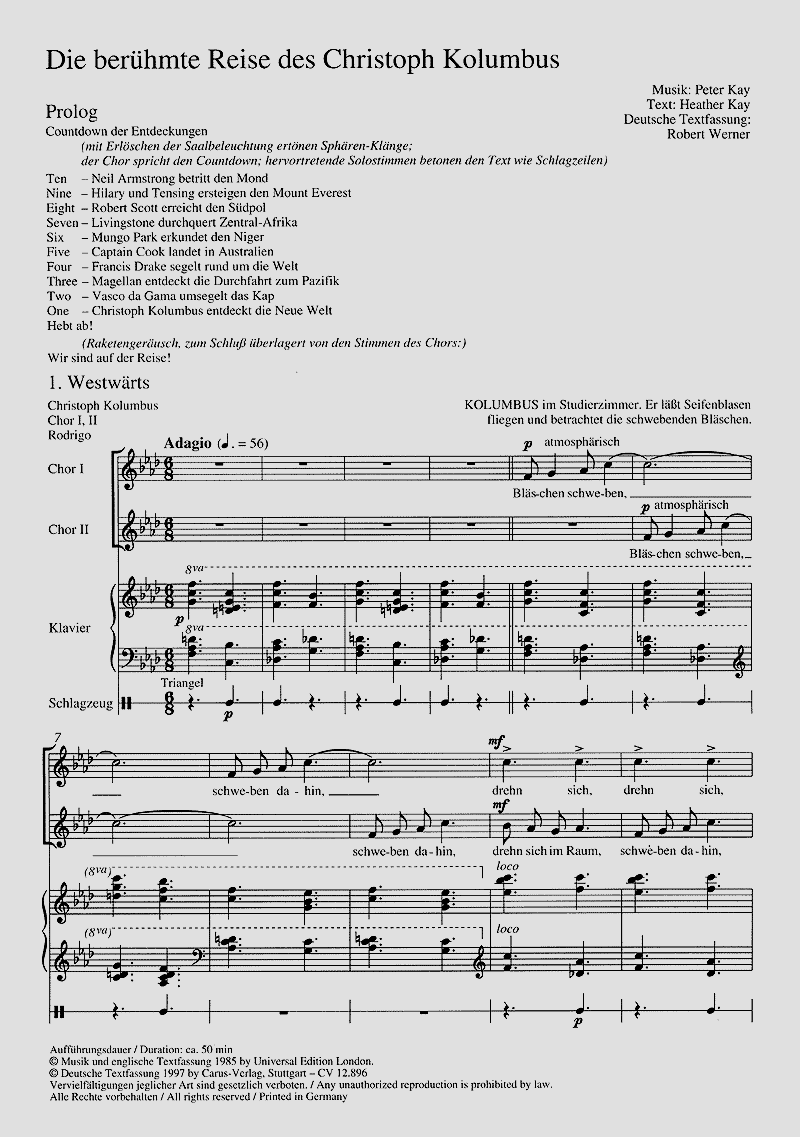 Musical für junge Leute - Das Musical beschreibt die Geschichte der Entdeckung Amerikas von der ersten Idee des Kolumbus bis hin zu seiner triumphalen Heimkehr nach Spanien. Einzeldarsteller (10 Singstimmen, darunter 2 grössere Rollen, div. Sprecher), Coro 2stg, Pfte, Git, Perc (1-4 Spieler).