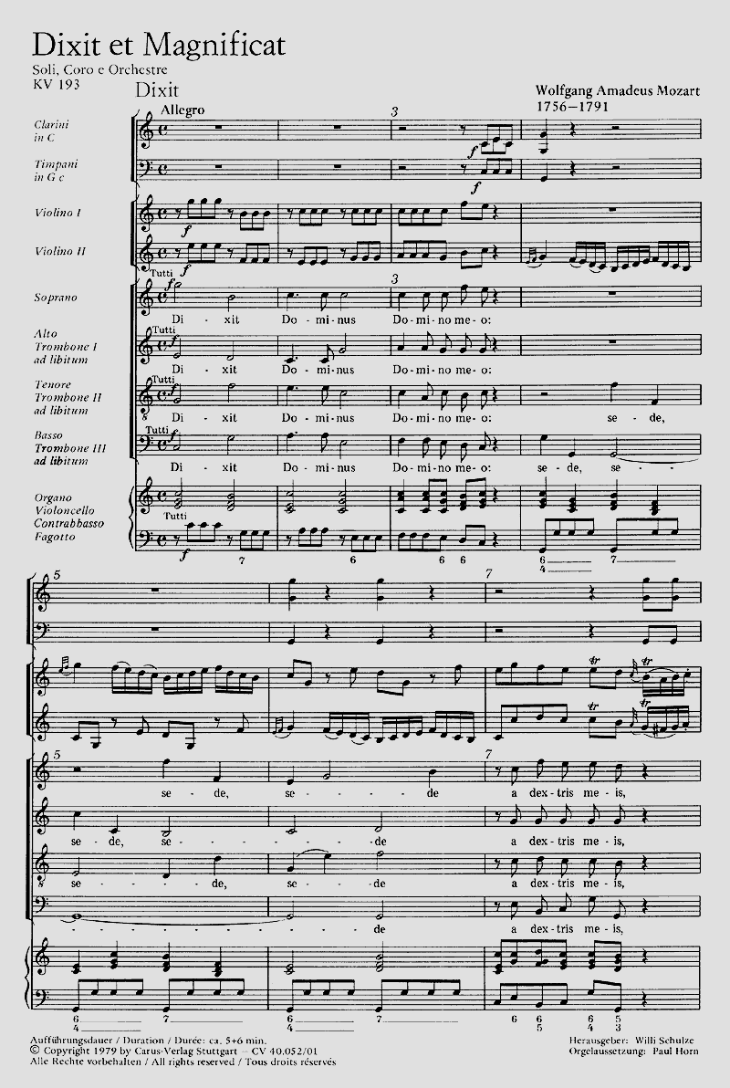 Von den Vespern und Vesperpsalmen die Mozart für den Salzburger Dom geschrieben hat, sind die Vesperteile 'Dixit et Magnificat' die frühesten. Sie gehören, wie auch die späteren vollständigen Vespern, zur kirchlichen Repräsentationskunst, wie sie im 18. Jahrhundert an allen namhaften Höfen gepflegt wurde. Soli STB, Coro SATB, 2 Ctr, Timp, 2 Vl, Bc, [3 Trb]