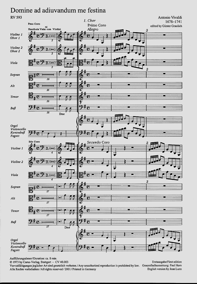 - Besetzung Gesang (hoch), 2 gemischte Chöre (SATB), 4 Violinen, 2 Violen und 2 Basso Continuo